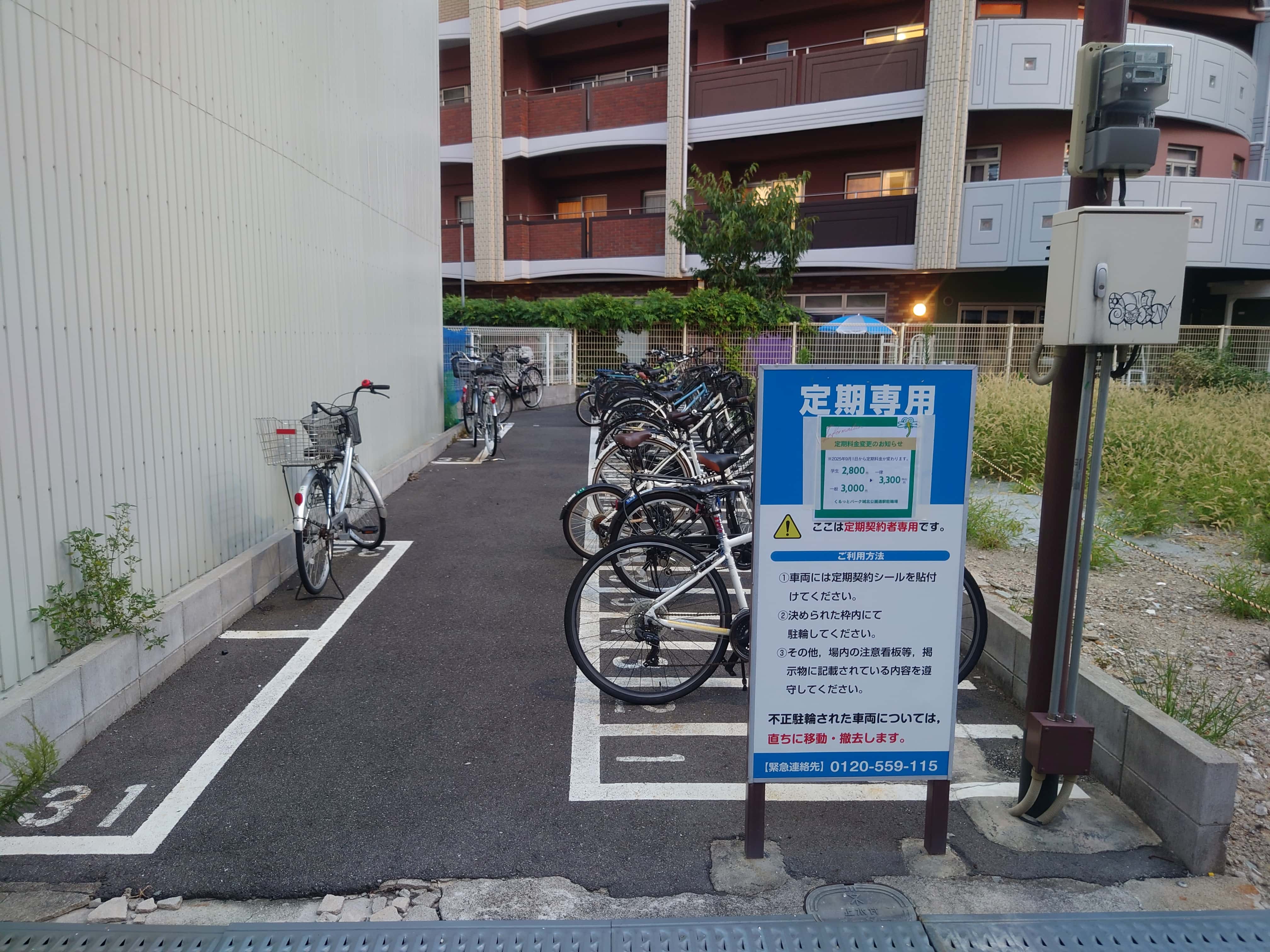 JRおおさか東線「城北公園通駅」駅東口より線路沿い北へ進み、JR淡路・新大阪駅方面側の城北公園通の手前の道路東側に位置しております駐輪場です。 現在満車の為ご予約のみ受け付けております。 ※現在多数の予約申請を受付しております。空きがでしだい順番のご案内となりますのでお待ちいただきますことを予めご了承下さい。 ★毎月1日からのご契約となります。(初回お振込み、次回以降毎月口座振替にて翌月分のお支払い) ★解約後順次のご案内となりますため場所の指定は承れません。 ★その他定期利用取扱事項ほか現地案内等に従いご利用くださいますようお願いいたします。(枠内駐車、不正駐車を含む第三者の不法行為等の甲の免責事項) ※2025年9月1日より学生料金を廃止し、一律3,300円/月となります。ご了承ください。