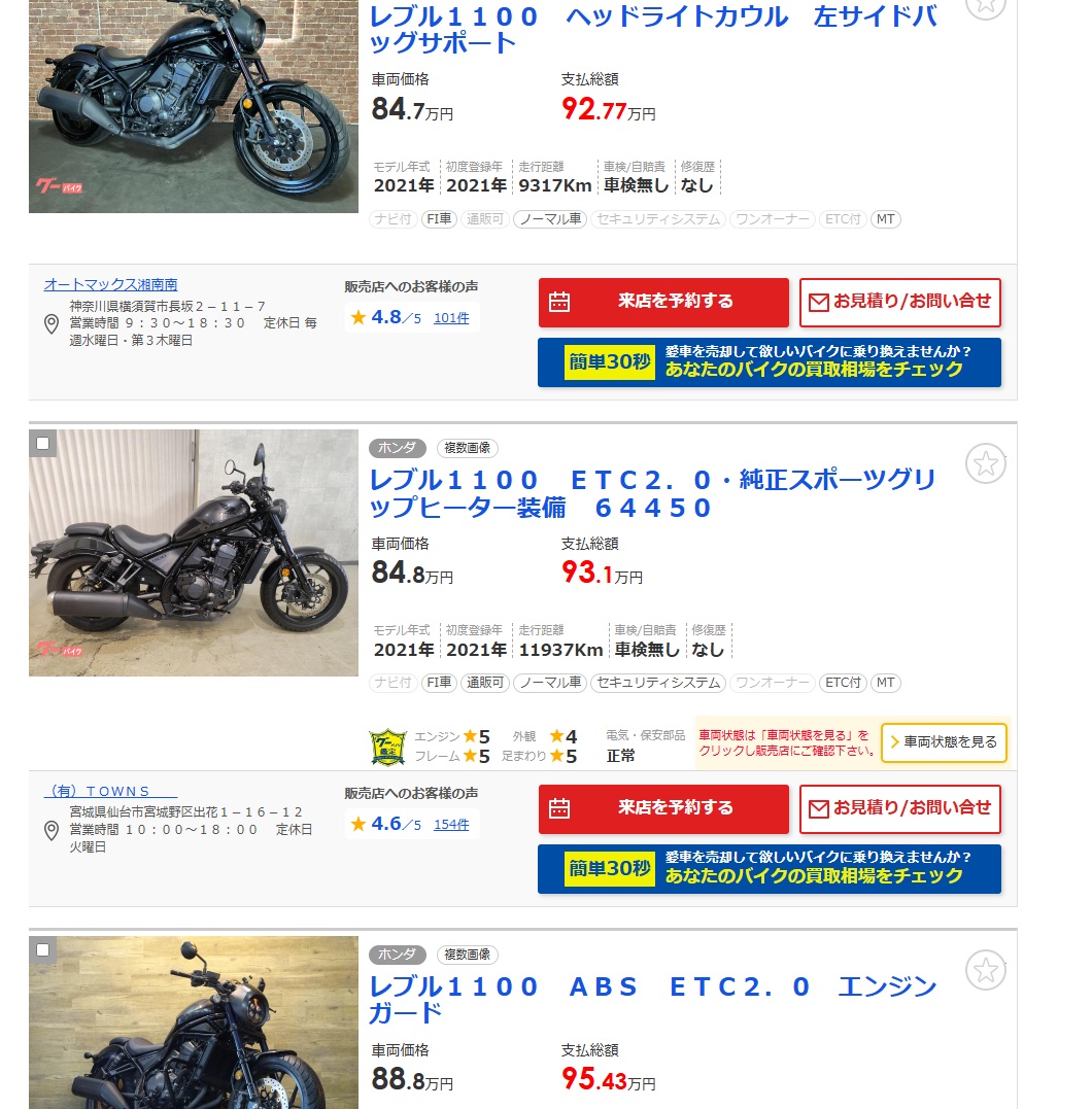たとえばホンダの大型バイク「レブル1100」の場合、新車価格は約120万円~となりますが(2025年4月時点)、中古になると以下のように80万円台で購入できる車両も流通しています。